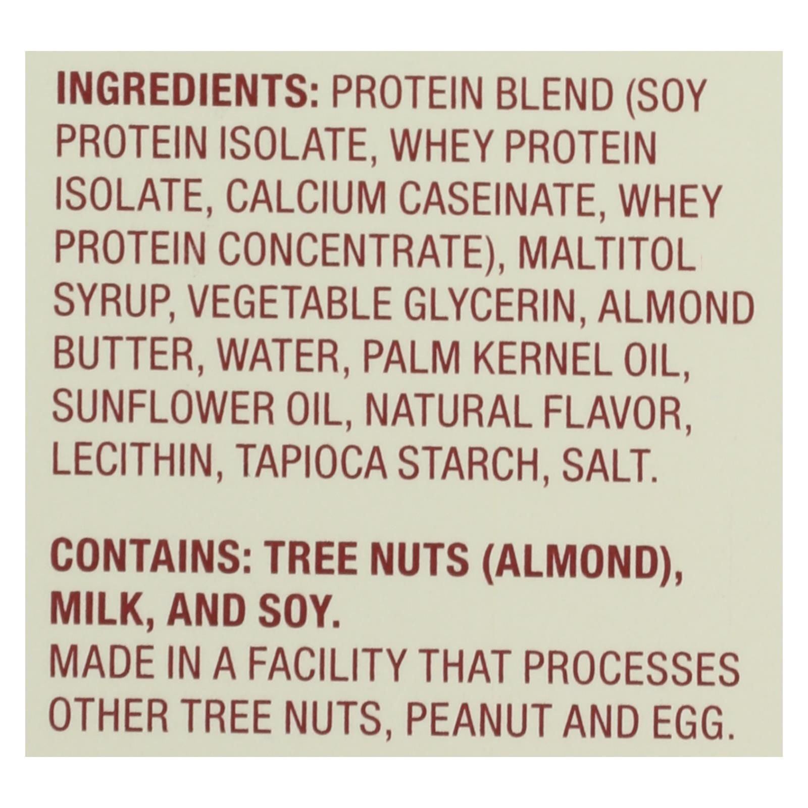 ingredients : protein blend (soy protein isolate, whey protein isolate, calcium caseinate, whey protein concentrate);maltitol syrup;vegetable glycerin;almond butter;water;palm kernel oil;sunflower oil;natural flavor;lecithin;tapioca starch;salt