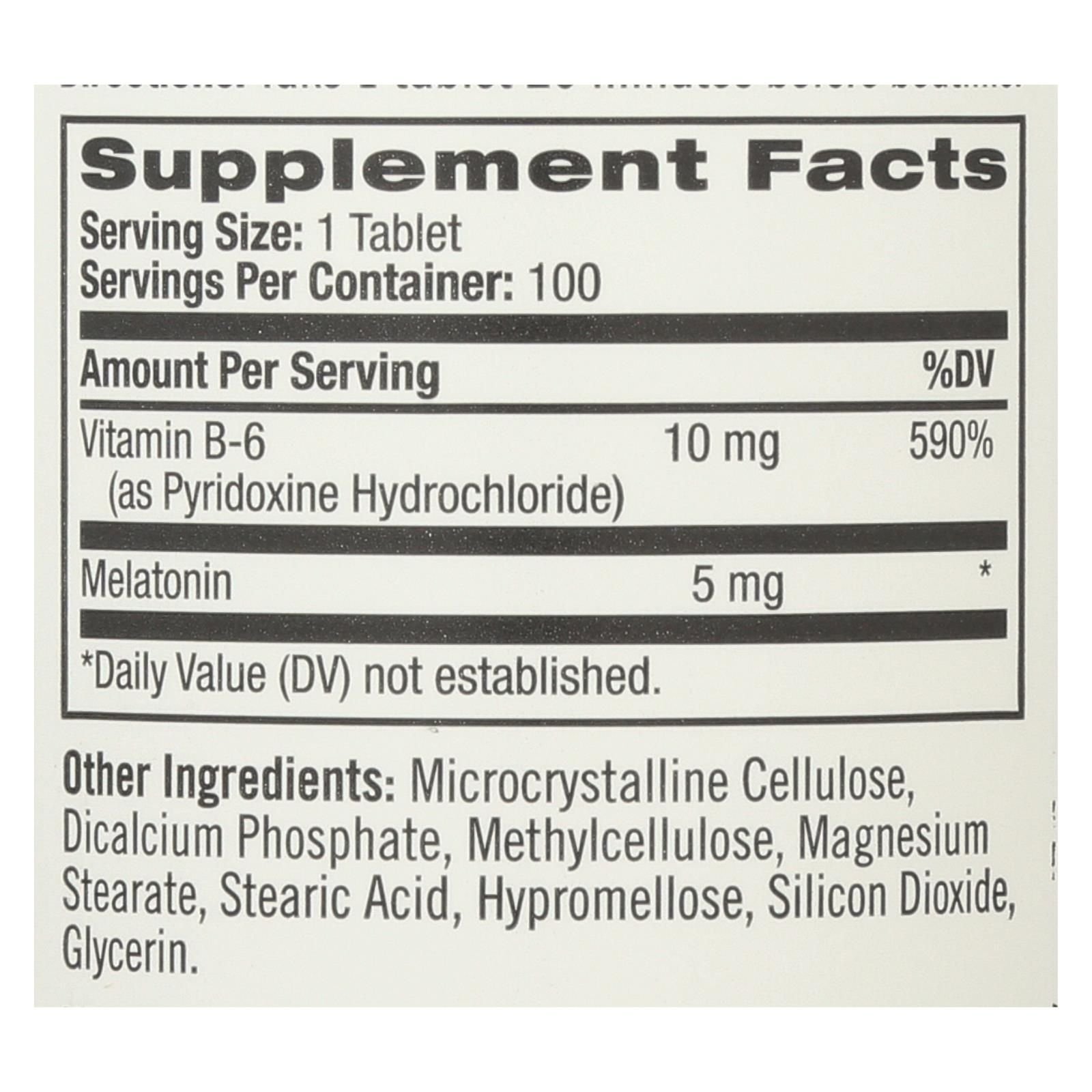 Natrol 5 mg. Time release melatonin helps you fall asleep faster and stay asleep longer with our two-layer time release tablets. Our preservative-free supplement is 100% drug-free and helps establish normal sleep patterns. Our supplement also contains vitamin b-6. Each bottle of melatonin contains 100 vegetarian tablets.